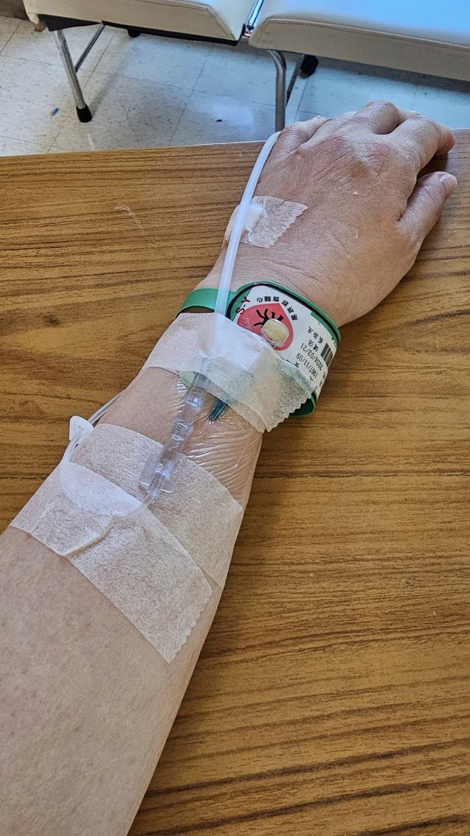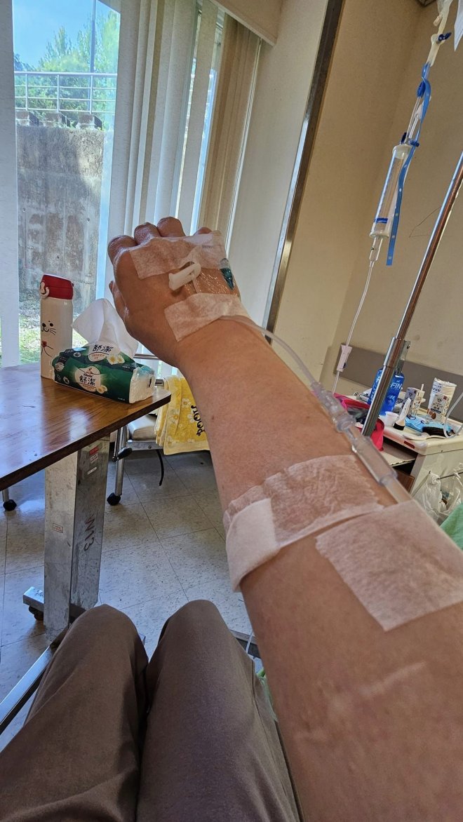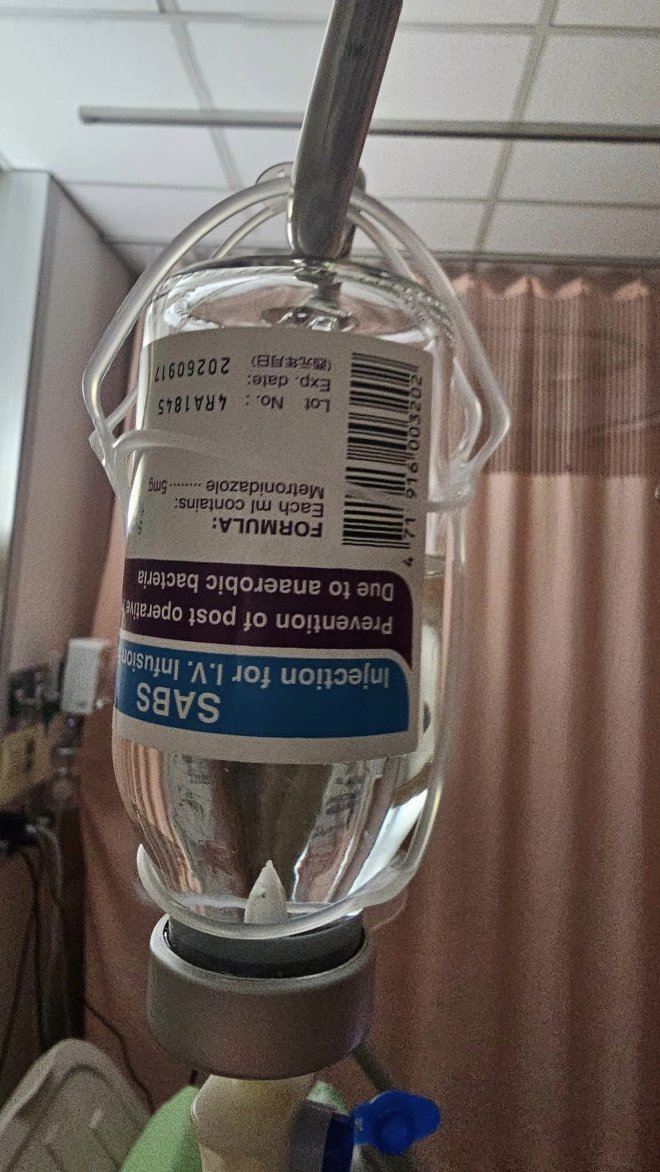 當時醒了又昏、昏了又醒的她,只要一張眼,就能看到頭上好幾包不同的點滴、抗生素,8小時就要打一罐抗生素,手背跟手掌都有好幾個針孔,完全禁食只能靠點滴維生,直到她真正清醒已經是第四天了,無奈自嘲:「是被『餓』醒的。」