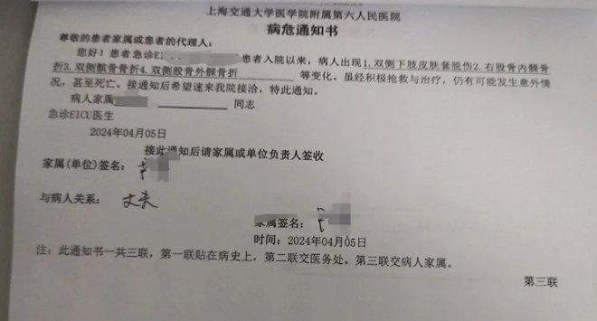 從盧男提供的病危通知書中可以看到,女子的傷勢包含雙側下肢皮膚套脫傷、右股骨內髁骨折、雙側髕骨骨折、雙側股骨外髁骨折,傷勢極為沈重,嚴重者可能導致死亡。至於目前的狀況則有所恢復,但醫生仍表示,「後期的主要風險在於感染,最大程度恢復的話,對正常生活影響不大」。