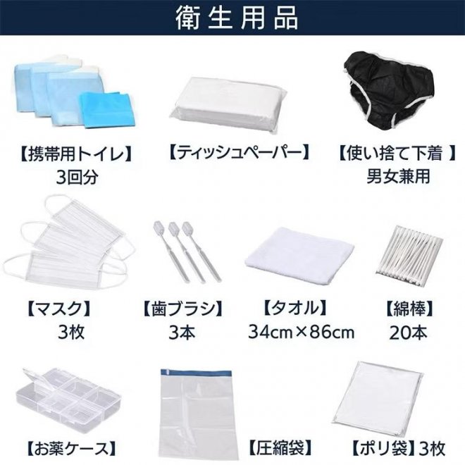 3|衛生用品(照顧生理需求的貼心細節)•携帯用トイレ(攜帶式簡易廁所)×3•ティッシュペーパー(衛生紙)•使い捨て下着(一次性內褲)•マスク(口罩)×3•歯ブラシ(牙刷)×3•タオル(毛巾)34×86cm•綿棒(棉花棒)×20•お薬ケース(分格藥盒)•圧縮袋(壓縮收納袋)•ポリ袋(塑膠袋)×3 👉 這一類讓你即使身處避難所也能保有最基本的衛生與尊嚴。