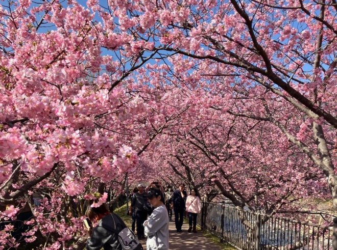 河津川沿岸步道 被櫻花覆蓋,宛如一條粉色夢幻隧道!💖