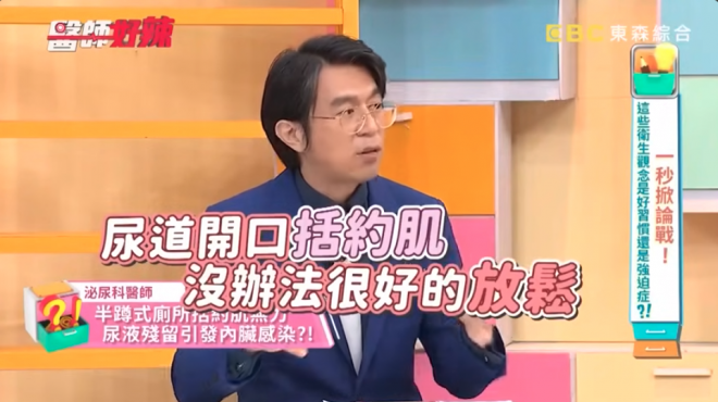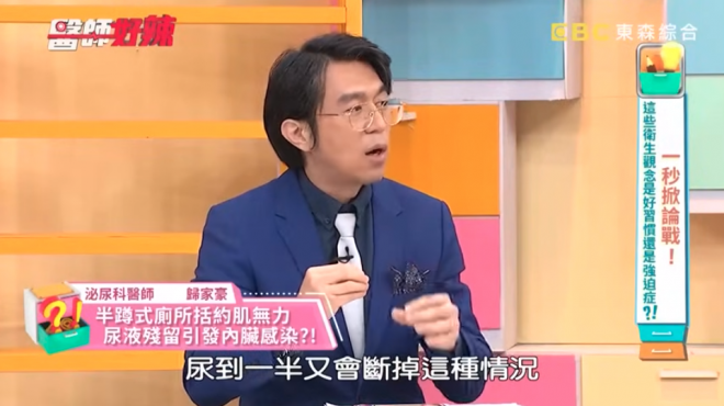 據《ettoday健康雲》報導,泌尿科醫師歸家豪在《醫師好辣》節目中提到這個案例,一名女性去離島旅遊,出發前就有排尿不適的狀況,到了離島她又擔心公廁不乾淨,就半蹲在坐式馬桶上排尿,但這個舉動卻會尿道括約肌無法放鬆,尿液中斷,膀胱內的餘尿增加。如果膀胱內的尿液是乾淨的還好,但她的尿液已帶有細菌,時間一長就引發膀胱發炎。
