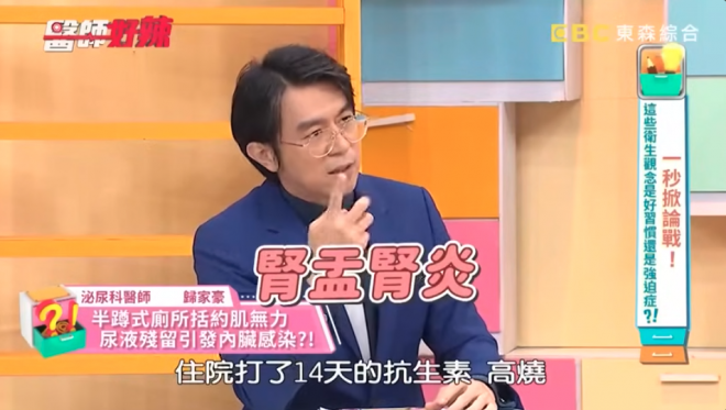 歸家豪醫師說明,女子回台灣後,開始出現血尿、發高燒,檢查後甚至發現尿液逆流回腎臟,確診引發腎盂腎炎,最終收治住院,一住就是14天,連續施打2週的抗生素治療,遭遇讓人心疼。他也藉由這個案例提醒大家,「半蹲式尿尿」會讓大腿無法放鬆,骨盆底肌會不由自主地收縮,就沒辦法把尿排得很乾淨。