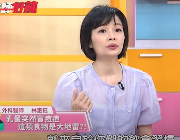 外科醫師林惠鈺也分享,過去曾有病人乳暈突然冒痘痘,很擔心自己是不是得癌症,上面有一個白點、一個紅點,林惠鈺便開藥膏讓她回去擦,一周後就好了,她也提醒病人,是不是平常很愛吃油炸物?病人點點頭,她便解釋,乳暈附近的油腺,會因為飲食習慣,分泌過於旺盛,如果塞住,就會造成像長粉刺那樣,再嚴重點,則會像青春痘變紅。