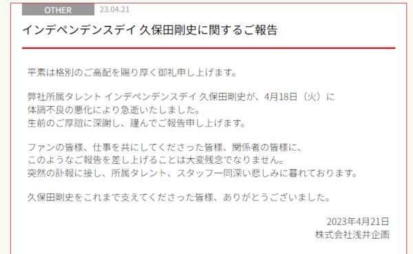 根據《ETtoday》報導,「獨立日」是由久保田剛史和內藤正浩組成,所屬經紀公司「淺井企劃」21日透過官網,向粉絲、共事過的工作人員及相關人士傳遞這項悲痛的訊息:「久保田剛史因身體健康狀況惡化,於週二(18日)驟逝...」坦言接到這突如其來的噩耗,仍傷心無比,感謝大家一直以來對久保田剛史的支持。