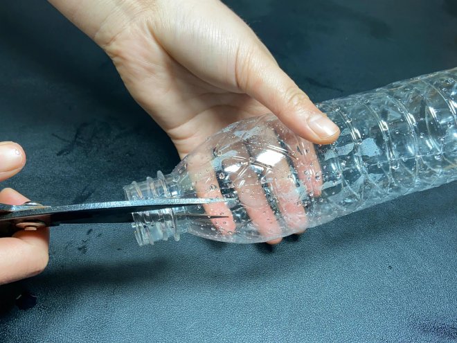 首先準備一個塑料瓶,把塑料瓶的瓶蓋拿下來,沿著平口網下剪開,剪到瓶子的2/3處,在平口的兩端都進行這樣子操作。