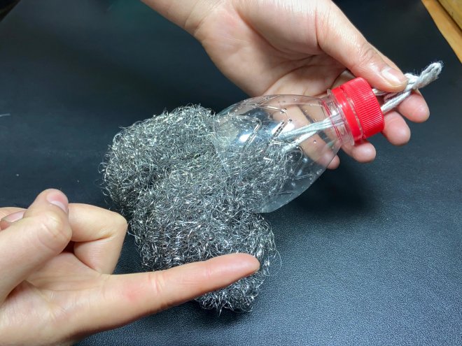現在我們把綁好的鋼絲球塞到塑料瓶裡面去。把繩子穿過塑料瓶的瓶蓋,然後蓋起蓋子,打個結,這樣就可以掛起來了。
