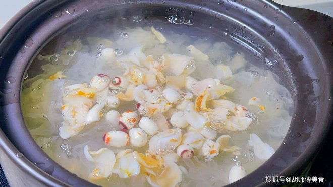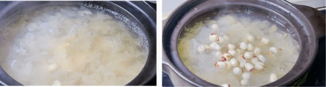 第五步:把銀耳放入到鍋中,大火將銀耳煮開後,然後改小火繼續煮10分鐘,接著再把蓮子、百合放入鍋中,繼續改小火燉20分鐘。