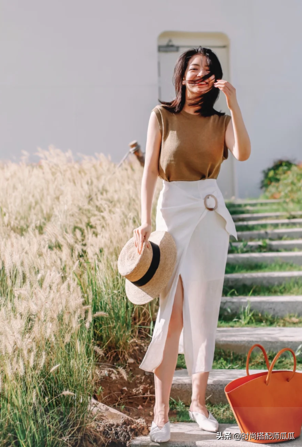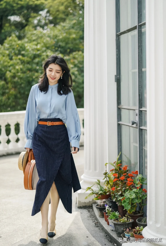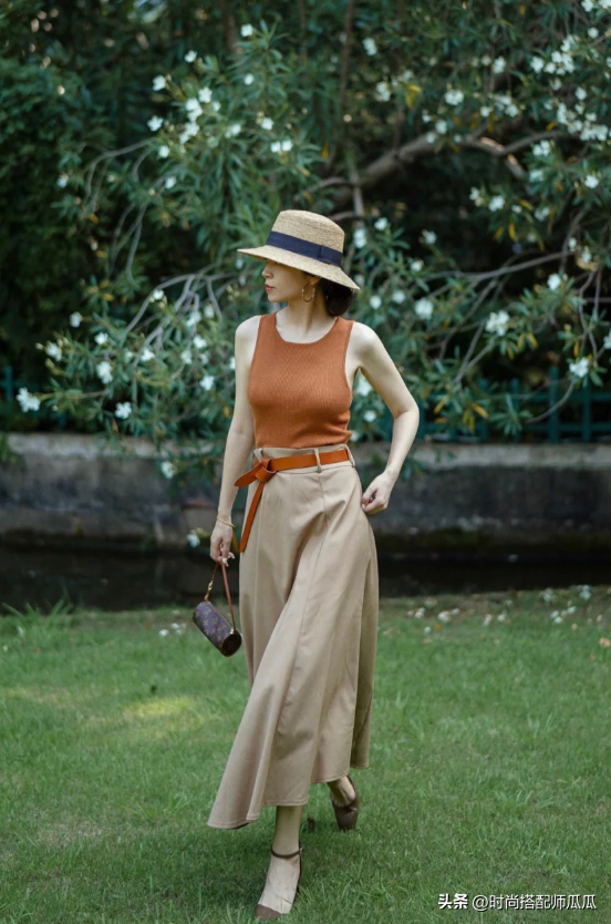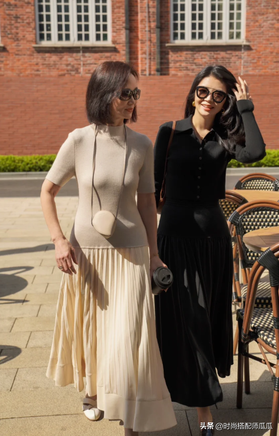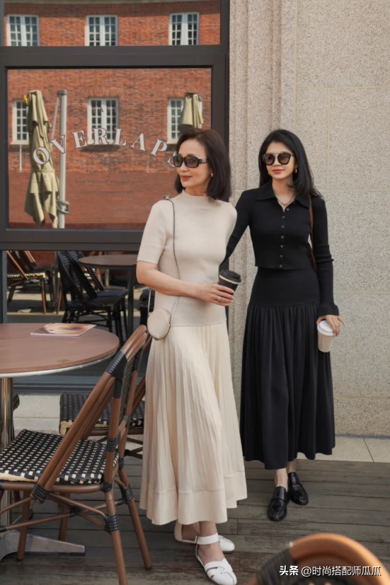 裙子的搭配與上衣還是在這裡推薦大家一種穿法,就是根據自己的身形狀態營造上下不同鬆緊線條的對比感,例如下半身的裙型是屬於百褶或者是略微寬鬆的膝下裙,那麼上身的搭配就推薦貼身或者是修身的一類,有了對比之差才能夠彰顯顯瘦感。