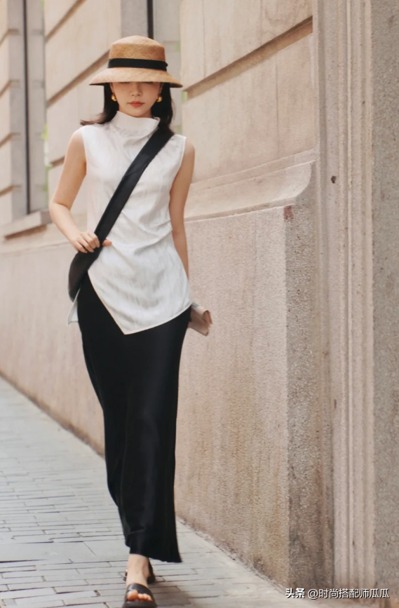 如果裙子與其他單品的搭配組合是黑白灰這樣的基礎色系,那麼關鍵之處就在於記得在面積的運用上要幾乎對等或者是四六分開有這樣更具和諧感。