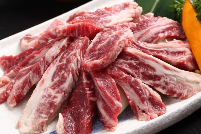 2、現在開始處理羊肉,將羊肉去筋去膜,做出來的口感好一些。隨後沖洗乾淨並將羊肉切成小塊,控干水分後放入到小碗之中,加入適量鹽、料酒和老抽,然後上手抓拌均勻腌製片刻;