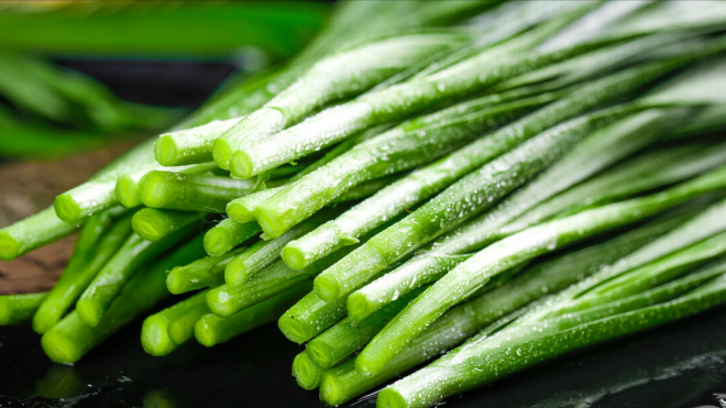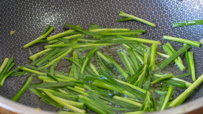 7、接著繼續起鍋燒油,油熱下韭菜梗。