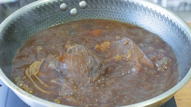 3、接著開始調味兒,生抽、老抽、料酒、黃豆醬、鹽,大火煮開後放入焯過水的牛肉。蓋上蓋子中小火煮1個半小時,煮熟后再燜半個小時。如果用高壓鍋的話,45分鐘左右就夠了。