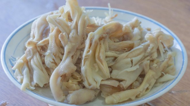 10、鴨掌泡好了先取一個出來,用小刀順著骨頭在鴨掌背上劃開,然後順著刀口用手指將肉和骨頭分離。先剔除這個較大的骨頭,再用同樣的手法把小一點的骨頭也全部分離出來,一個完整的無骨鴨掌就做好了。