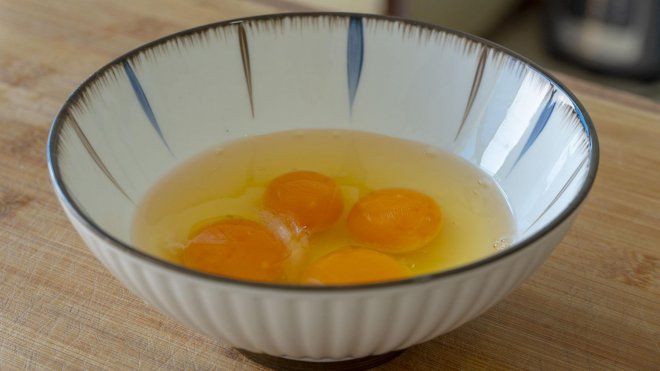 2、接著碗里打4個雞蛋,加一勺鹽后先攪散。
