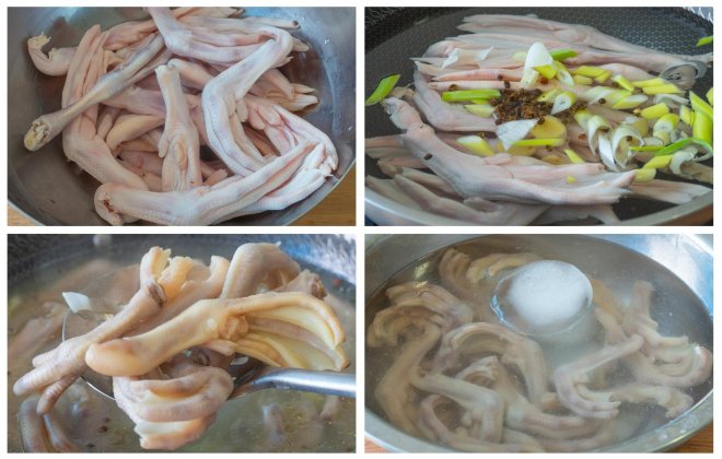 3、起鍋燒水,冷水下入鴨掌焯水,加薑片、大蔥、料酒、花椒去腥。
