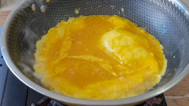6、等到蛋液凝固后再炒成雞蛋塊兒,不要把雞蛋炒得太碎了,大塊兒炒出來會更漂亮,看起來也更有食慾,先盛出來備用。