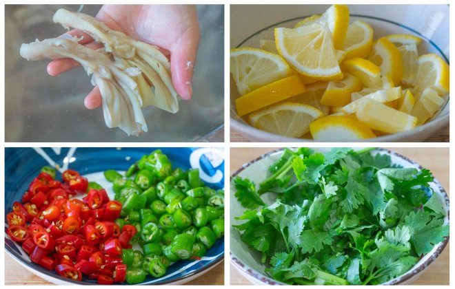 食材清單:鴨掌2斤、檸檬1個、大蒜1頭、香菜、小米辣、青線椒、薑片、大蔥、料酒