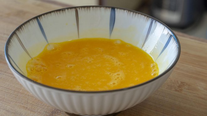 4、攪拌均勻后直接倒入蛋液裡面,這樣可以讓雞蛋炒出來更嫩滑,這個是這道菜的主要關鍵點哦!