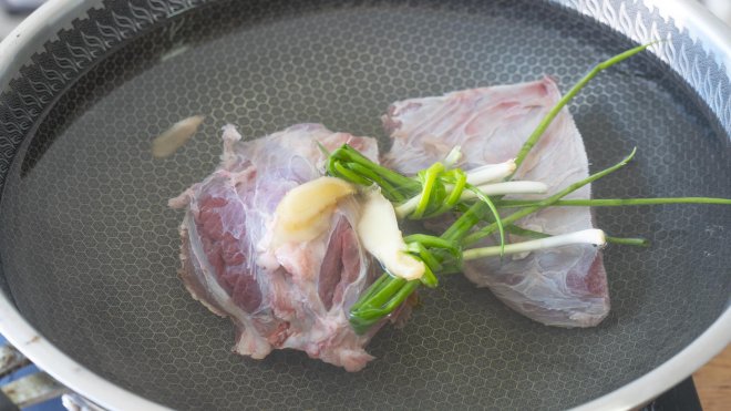 食材清單:半邊雞腿2個、蔥、薑片、料酒、3個黃梔子