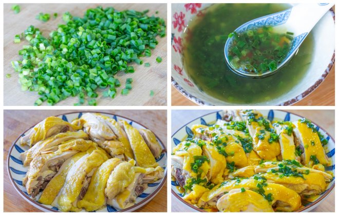 7、小蔥一把,切成蔥花后裝入碗里,再淋上一勺熱油,瞬間蔥香味兒就出來了,再來上一勺白灼汁和一勺雞湯,拌勻后真的是超級香。