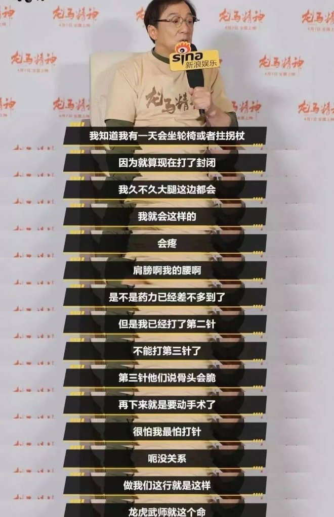 成龍今年在宣傳他的電影《龍馬精神》時表示,自己現在是打了封閉針,如果再打的話就需要動手術了,他也做好了自己即將坐輪椅和拄拐杖的準備,聽著確實很心酸。