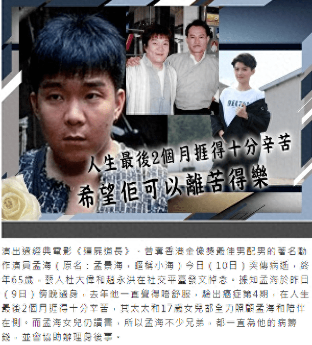 雖然入行時間長,但由於當時的片酬並不高,孟海的生活其實並沒有那麼優渥,老來得女的他還需要供養17歲的女兒上學,因此當孟海患癌後許多好友為他籌捐醫藥費,在他最困難的時候拉了他一把。