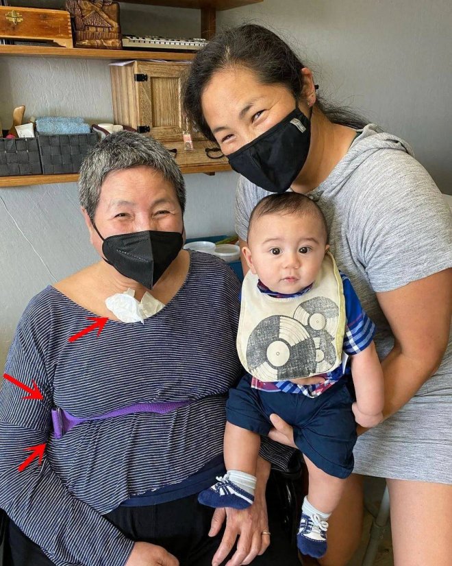 但如今已經77歲的她身體狀況大不如前,行動也變得遲緩,從曬出的照片可以看到,鄭佩佩如今還需要使用固定帶,甚至需要將衛生紙夾在領口處,防止口水的溢出。