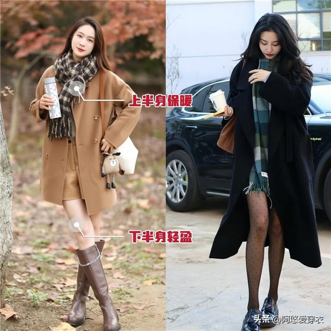 比較常見的方式就有這種上半身穿大衣和圍巾,下半身露腿的造型,下半身直接光腿,或者是搭配上一條黑絲以及光腿神器,可以讓我們的腿部線條得以展現,而且也削弱了造型的厚重感,讓身材優勢展現出來。
