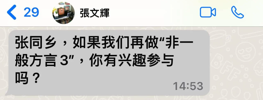 導演張吉安也曬出和張文輝生前對話,只見張文輝來訊邀約:「張同鄉,如果我們再做非一般方言3,你有興趣參與嗎?」沒想到卻成為兩人最後道別,不捨哀悼:「已經答應你了,歌詞也寫一半了......輝兄,一路走好。」已淡出銀幕前的女星林秋燕也哀悼:「明白人生無常,但還是難接受,感恩我們能成為雖陌生,但卻熟悉的朋友…阿輝,一路走好,願您的家人節哀順變。」