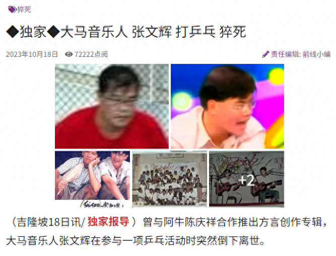 根據《三立新聞》報導,張文輝不僅是一名歌手,更是馬來西亞知名音樂人,一生創作多首歌曲,2000年時與男星阿牛(陳慶祥)合作推出方言創作專輯,以一首歌曲〈我們一家都是人〉爆紅,才華洋溢備受喜愛,昨日(18日)卻突傳憾事,他在參加打乒乓球活動時突然昏迷倒下,當場猝死,緊急送醫搶救還是救不回,享年51歲,噩耗震撼演藝圈。