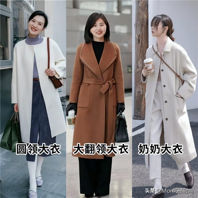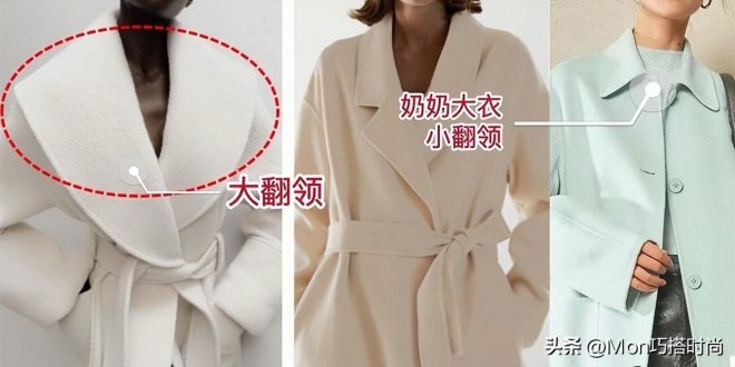 別聽到奶奶大衣別就立馬拒絕,雖然名字聽起來好像有點老氣,但實際上在今年所流行的奶奶大衣還是蠻洋氣的,一點都不土,那麼什麼樣的大衣是奶奶大衣呢?我們可以把常規的圓領大衣還有大翻領大衣和奶奶大衣去進行對比。