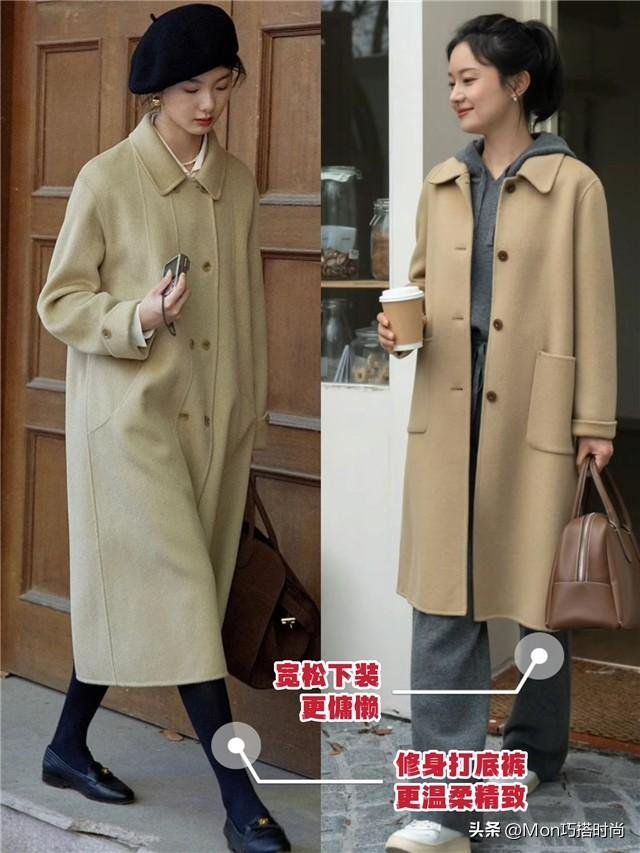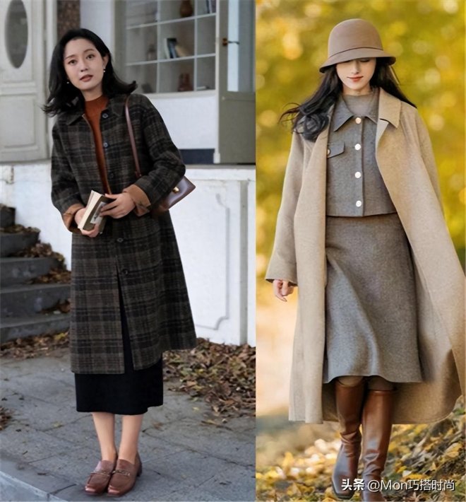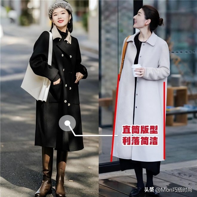 選擇奶奶大衣的時候,版型建議還是儘可能地以這種挺括的直筒型為主,像那種過於寬大的廓形大衣穿在身上還是容易顯得臃腫,橫向拉寬了我們的身材,但是藉助這種直筒版型的大衣,可以用利落簡潔的版型去修飾我們的腰身,這樣的大衣穿起來更有利於遮肉顯瘦。