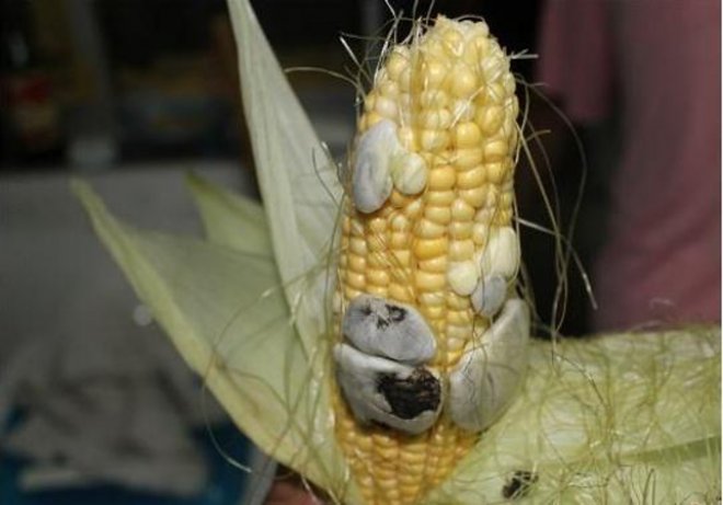 受玉米黑穗菌感染的玉米穗會出現類似腫瘤的構造,把外面的薄膜弄破時裡面會散出許多黑色的粉末,此菌的傳染力很強,一旦有一棵玉米感染此病後,整區內的玉米都無法倖免,感染後的玉米穗無法食用。