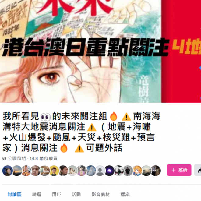 📈 Facebook群組人數暴增,恐慌情緒蔓延以「我所看見的未來」為主題的Facebook群組為例,該群組專注於討論日本漫畫家竜樹諒(たつき諒)在其作品中對2025年7月5日可能發生大災難的預言。據報導,該群組的人數在短時間內迅速增長,反映出公眾對此話題的高度關注。