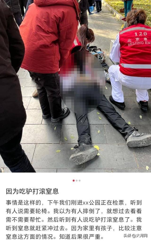 11月28日,記者聯繫上了發帖網友黃女士,她說,事發地點就在天壇公園西門裡面100米左右的小路上。聽說有遊客吃了「驢打滾」窒息後,她和丈夫趕緊衝過去幫忙。